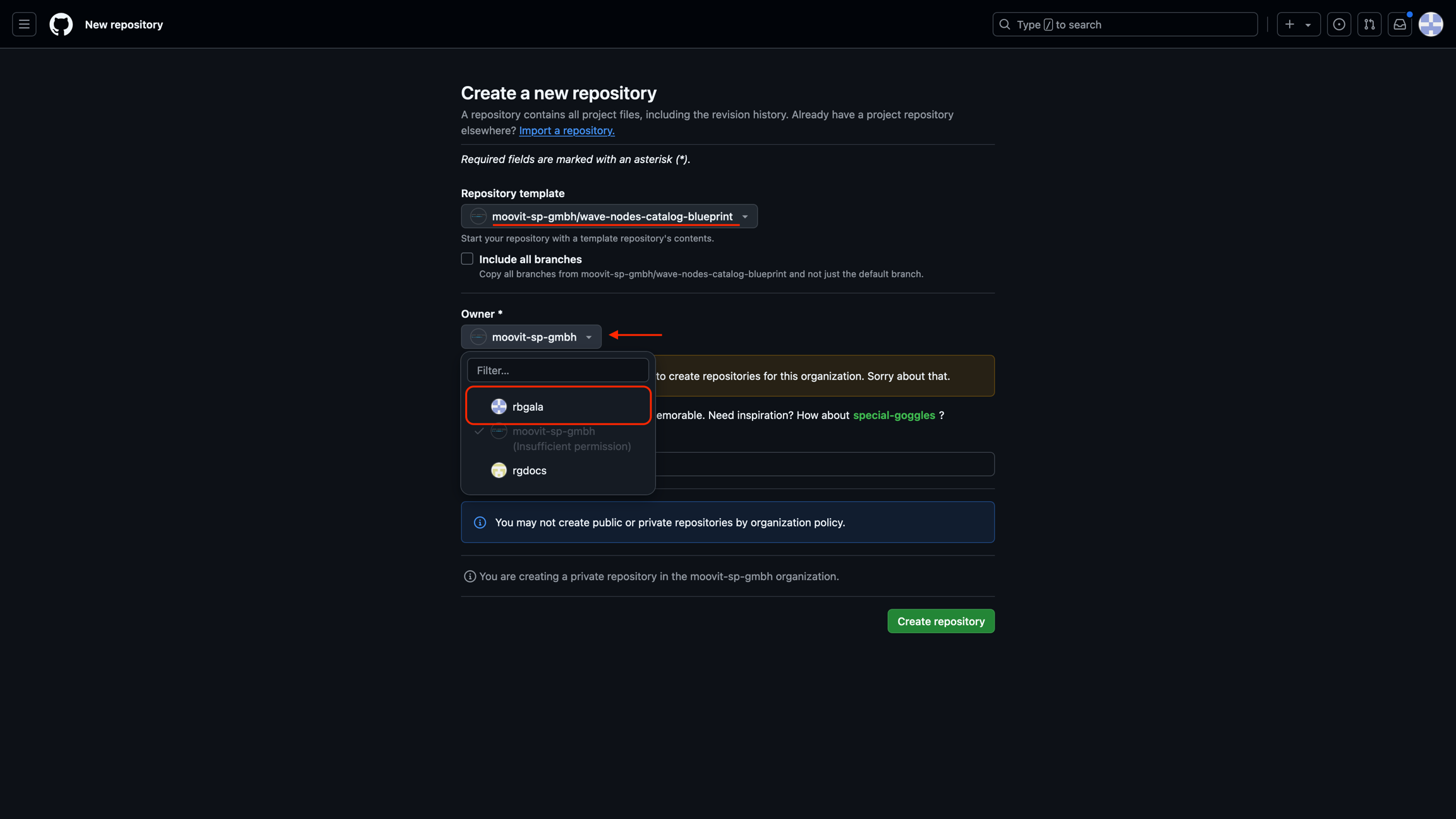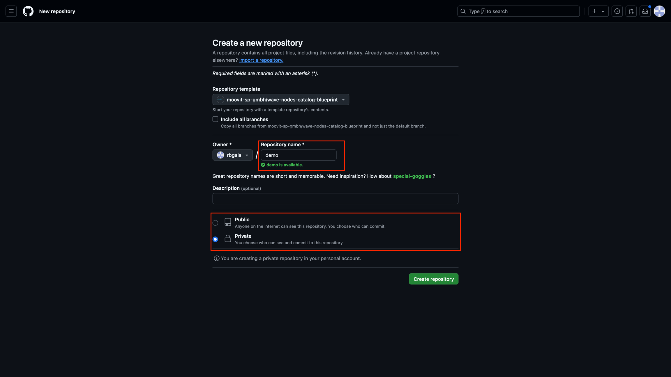 On the "Create new repository" page, ensure "Repository template" is set to "moovit-sp-gmbg/wave-nodes-catalog-blueprint", and set the owner to your account.