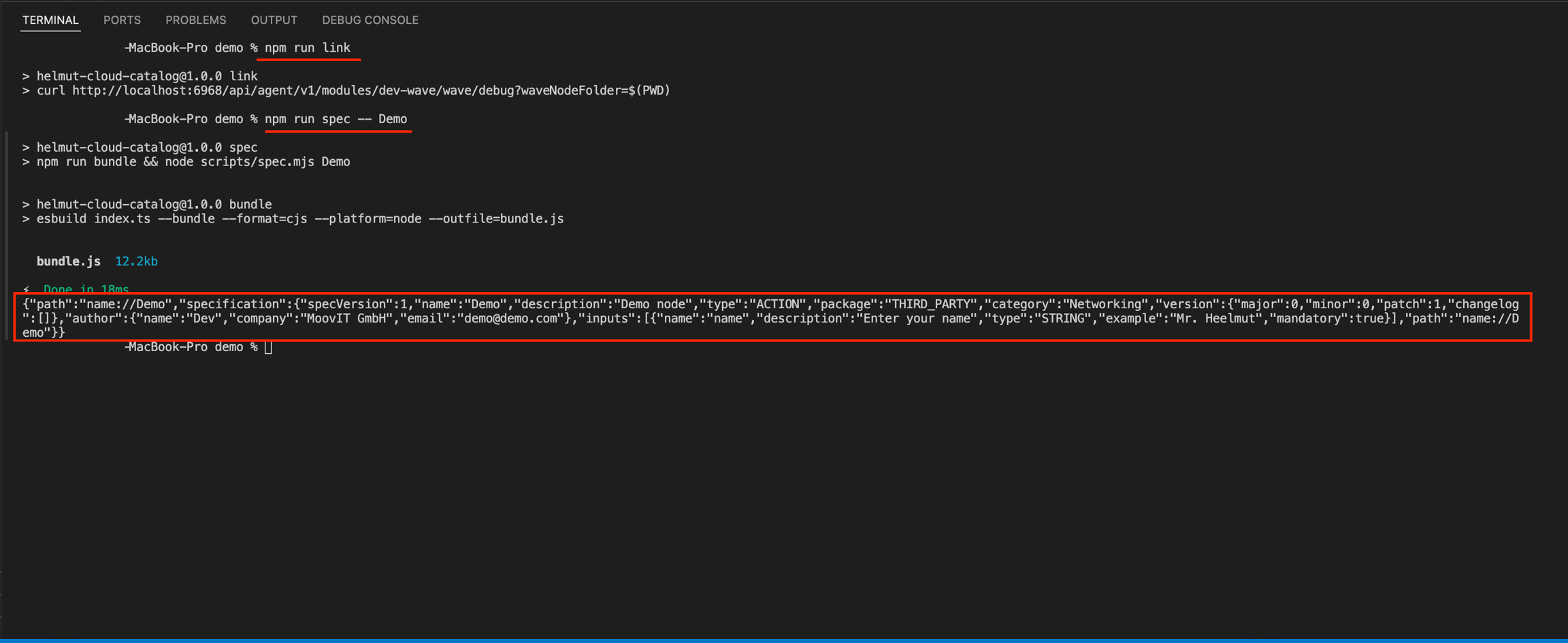 npm run link. This command automatically links the helmut.cloud agent to the local file path where your node code lives on your local machine.Finally, generate the specification for your node by running::